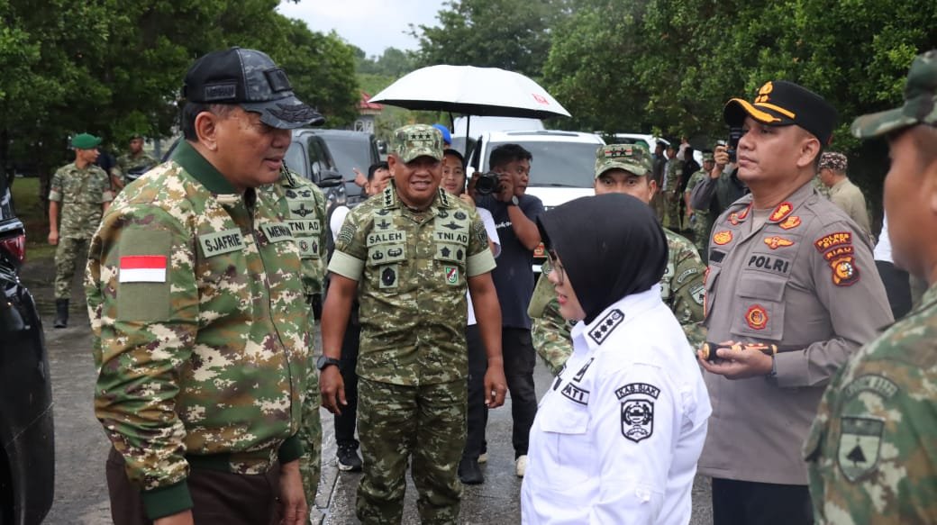 Rombongan Menhan RI disambut oleh Kasdam XIX/Tuanku Tambusai Brigjen TNI Rudi Hermawan, S.E., M.M., Dandim 0322/Siak Letkol Czi Andy Kurniawan, S.Hub.Int., Bupati Siak Dr. Afni Z., M.Si., Kapolres Siak AKBP Eka Ariandy Putra, S.H., S.I.K., M.Si., serta Wakil Bupati Siak Samsurizal, S.Ag., M.Si.