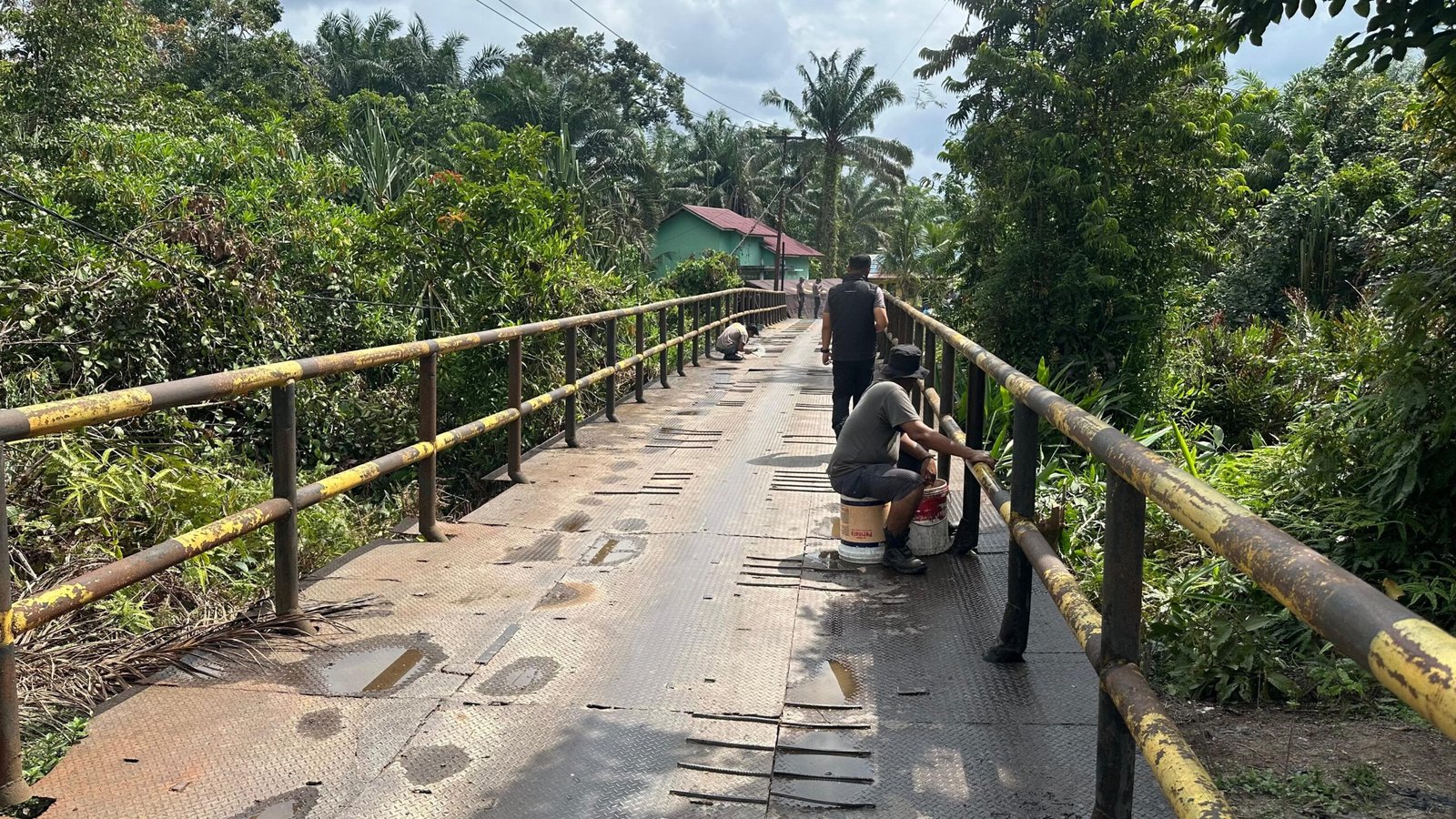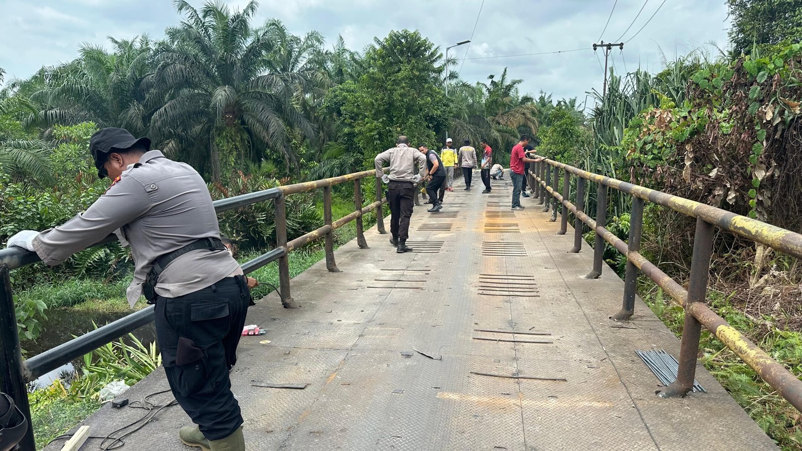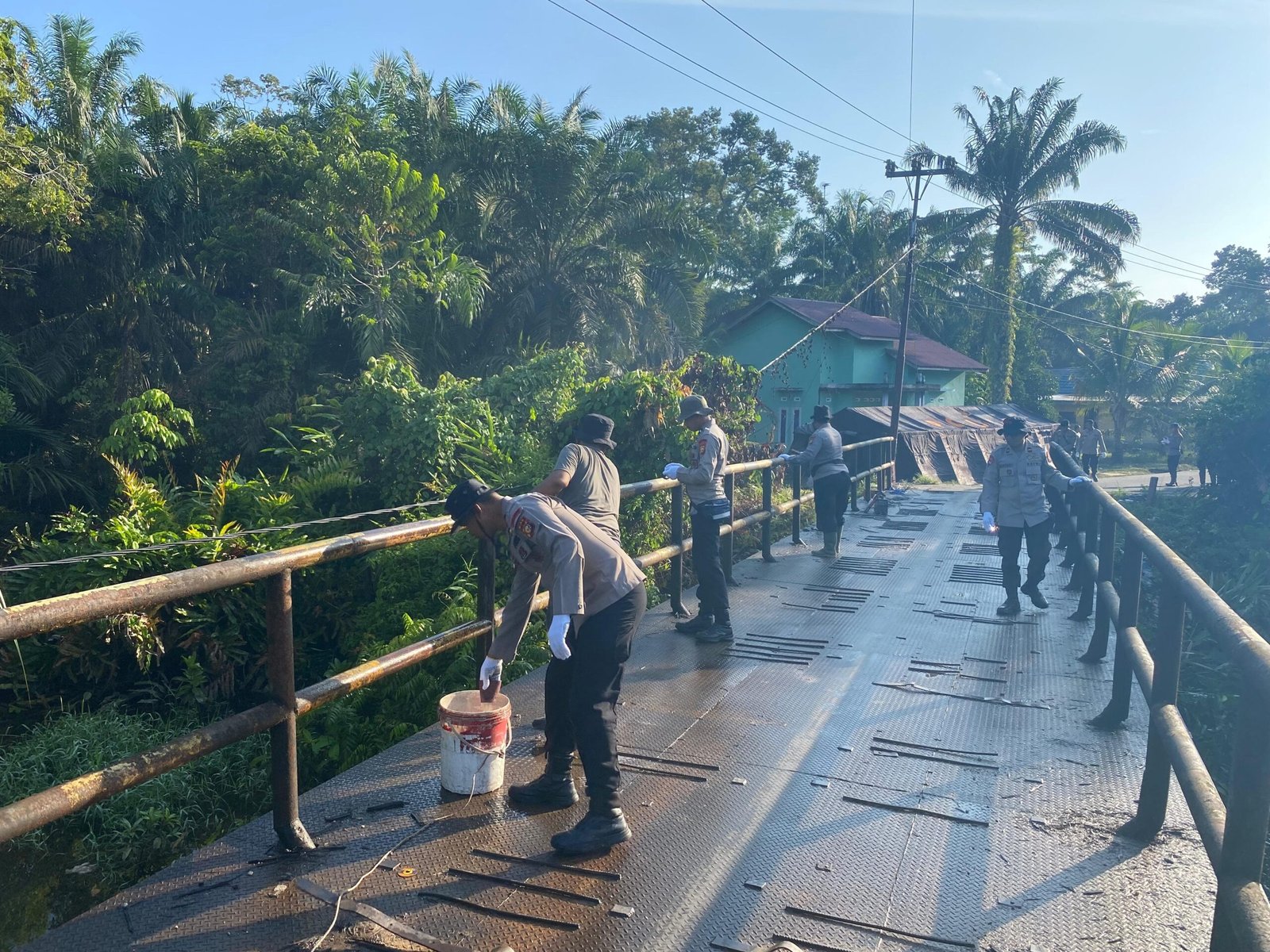 , sekitar pukul 11.00 WIB, personel Polri dari Polda Riau dan Polres Siak bersama masyarakat Kampung Buatan I, Kecamatan Koto Gasib, Kabupaten Siak, bergotong royong melaksanakan renovasi jembatan yang menjadi akses vital warga setempat. 29/01/2026.