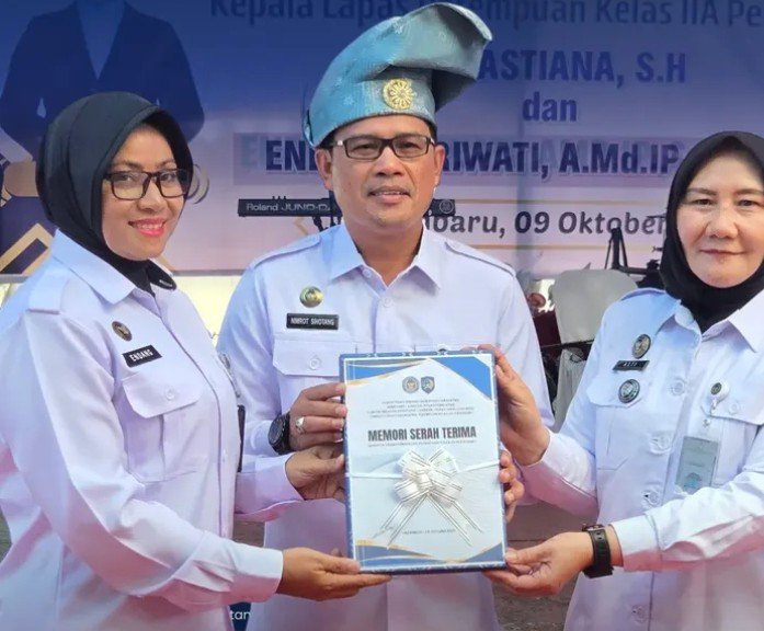 Pekanbaru — Lintaswartakrimsus. Suasana haru dan penuh kebersamaan mewarnai kegiatan Serah Terima Jabatan (Sertijab) dan Pisah Sambut Kepala Lembaga Pemasyarakatan Perempuan Kelas IIA Pekanbaru yang digelar di aula utama lembaga tersebut pada Kamis (9/10). Dalam acara ini, Ibu Sri Astina resmi menyerahkan jabatan Kepala Lapas Perempuan Pekanbaru kepada pejabat baru, Ibu Endang Sriwati. Kamis. 9/10/2025.