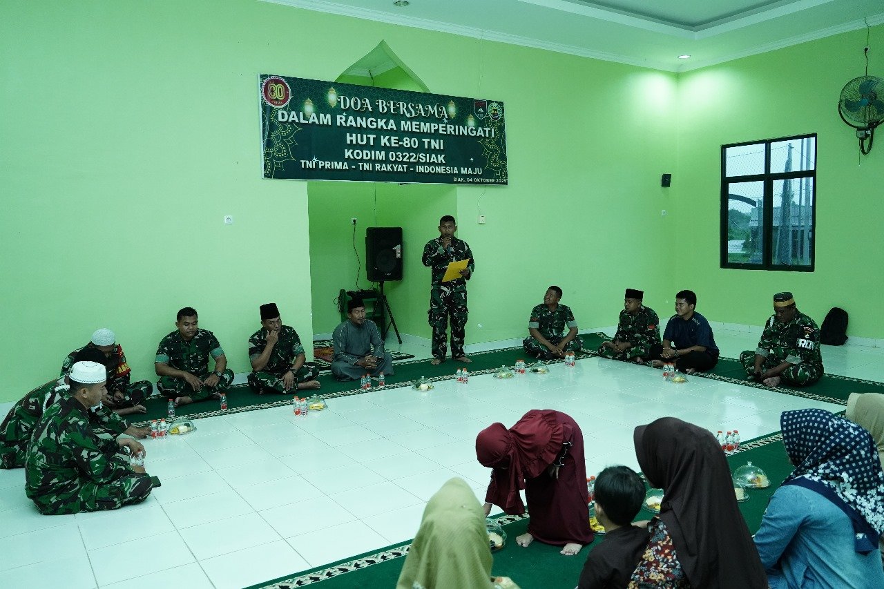 Dalam sambutannya, Pasi Ops Kodim 0322/Siak Kapten Inf A.T. Dasopang menyampaikan bahwa doa bersama ini bukan hanya sebagai rangkaian peringatan HUT TNI ke-80, tetapi juga menjadi momentum untuk mempererat kebersamaan, memperkokoh persatuan, serta mengingatkan kembali bahwa kekuatan TNI bersumber dari doa dan dukungan rakyat.