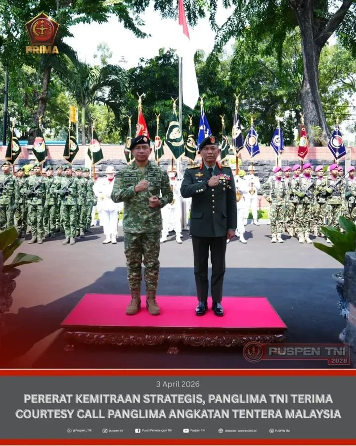 JAKARTA – (Puspen.) Dalam rangka mempererat kemitraan strategis dan diplomasi militer antara Indonesia – Malaysia, Panglima TNI, Jenderal TNI Agus Subiyanto menerima Courtesy Call Panglima Angkatan Tentera Malaysia (ATM), Jeneral Datuk Haji Malek Razak Bin Sulaiman, bertempat di Subden Merdeka Barat, Jakarta Pusat.(04/04/2026).
