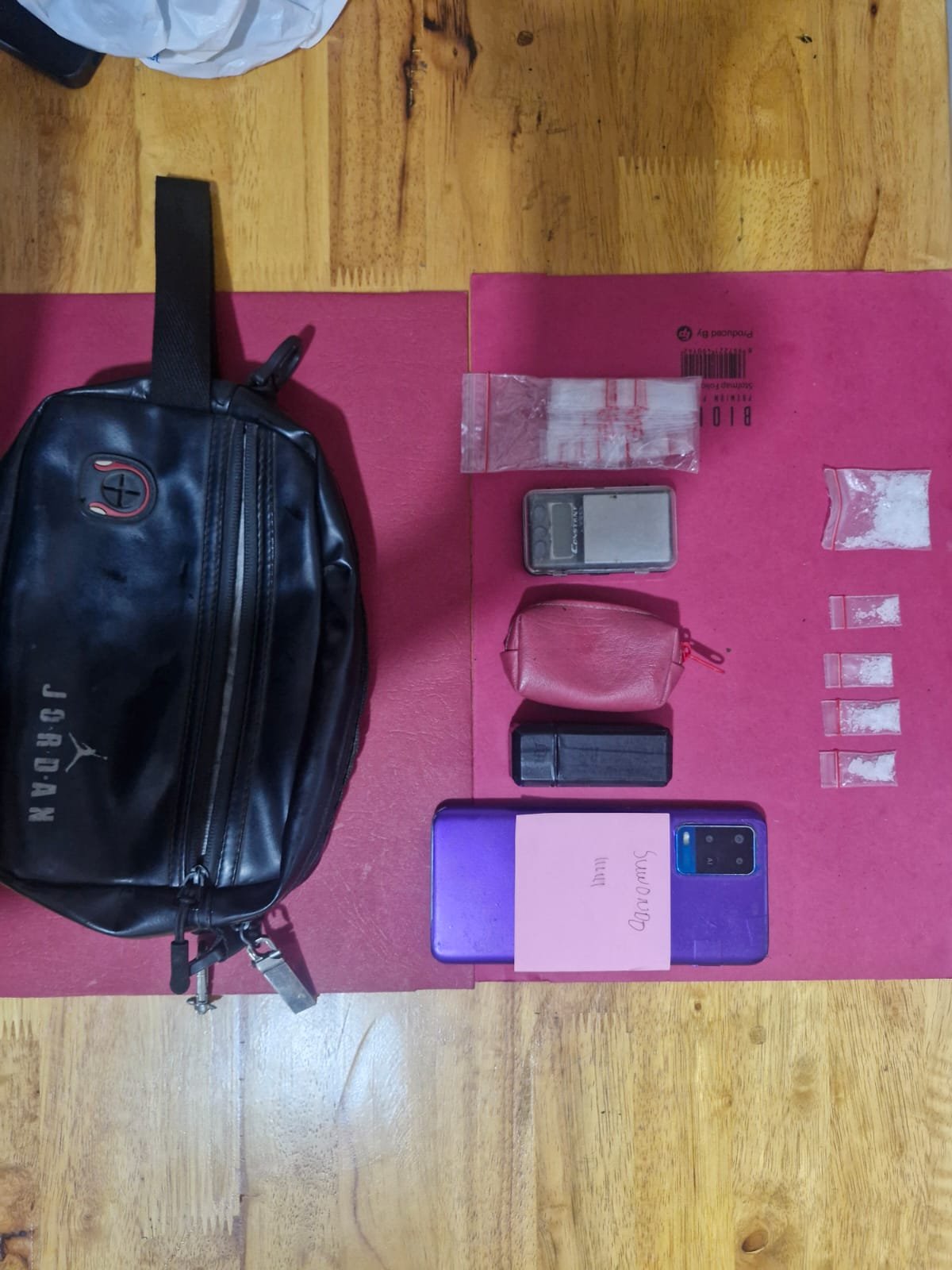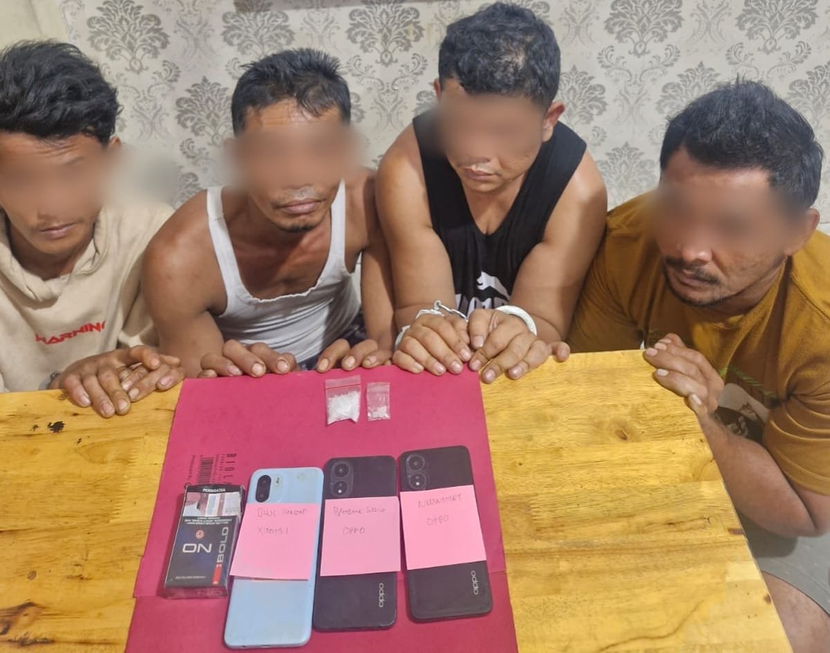 Dari hasil penggeledahan, polisi menemukan dua paket sabu yang disembunyikan di atas meja dan di dalam kotak rokok di rumah tempat para tersangka berkumpul.