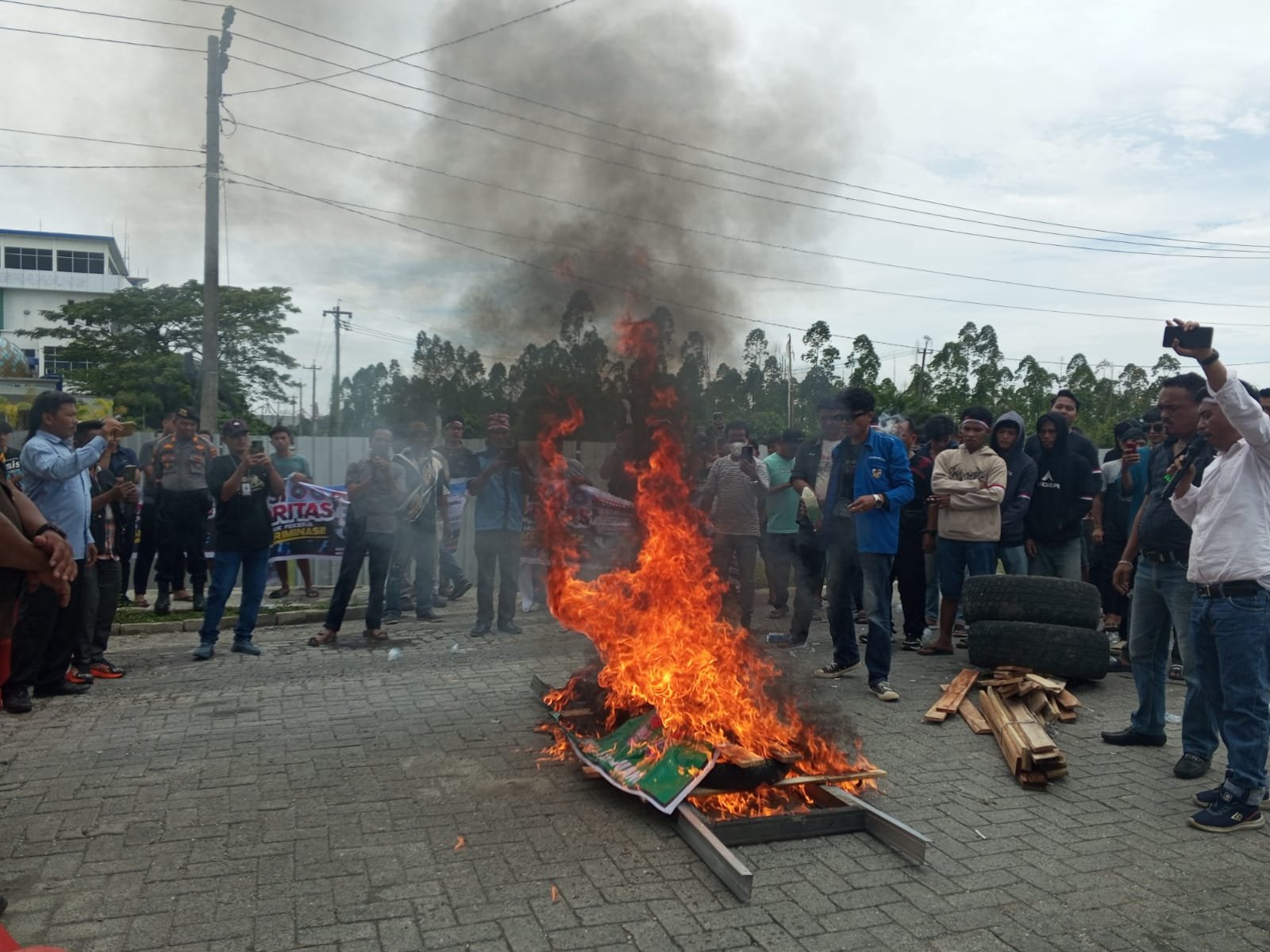 ​Suasana di lapangan sempat memanas saat massa melakukan aksi bakar ban bekas sebagai simbol kekecewaan ataupun protes. Meski demikian, rangkaian aksi tetap berjalan teratur dengan penyampaian orasi dan menyanyikan lagu Indonesia Raya sebagai bentuk komitmen perjuangan masyarakat sipil.
