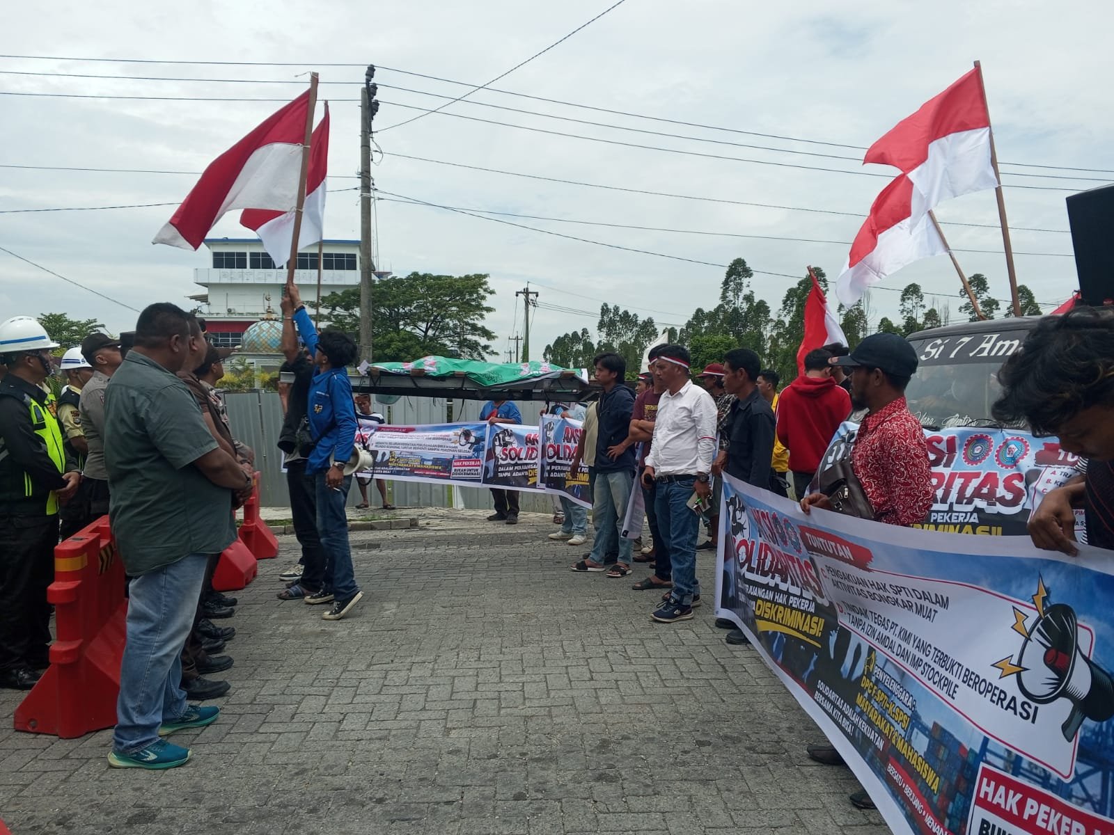 ​Massa aksi yang mulai berkumpul sejak pukul 11.00 WIB menyuarakan kekhawatiran mendalam terkait keberadaan stockpile (penumpukan) cangkang milik PT KIMI.